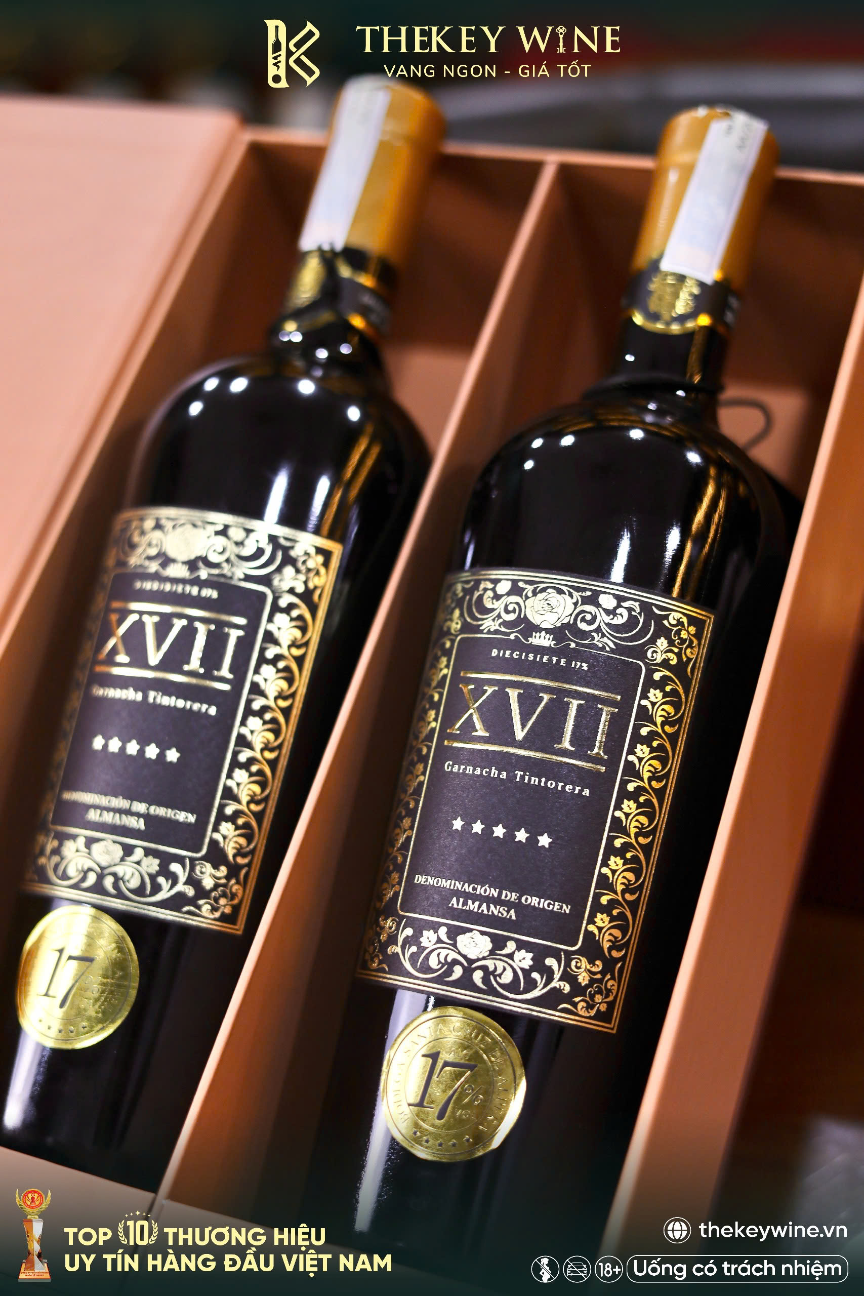 Rượu vang đỏ XVII CRIANZA 17% là dòng vang cao cấp đến từ Bodegas Santa Cruz de Alpera – Tây Ban Nha, một nhà làm vang nổi tiếng với những chai rượu mang phong cách mạnh mẽ và đậm đà đặc trưng của vùng Almansa. Chai vang được làm từ giống nho Garnacha Tintorera – một trong những giống nho đỏ nổi bật của Tây Ban Nha, nổi tiếng với màu sắc đậm và cấu trúc rượu đầy cá tính.