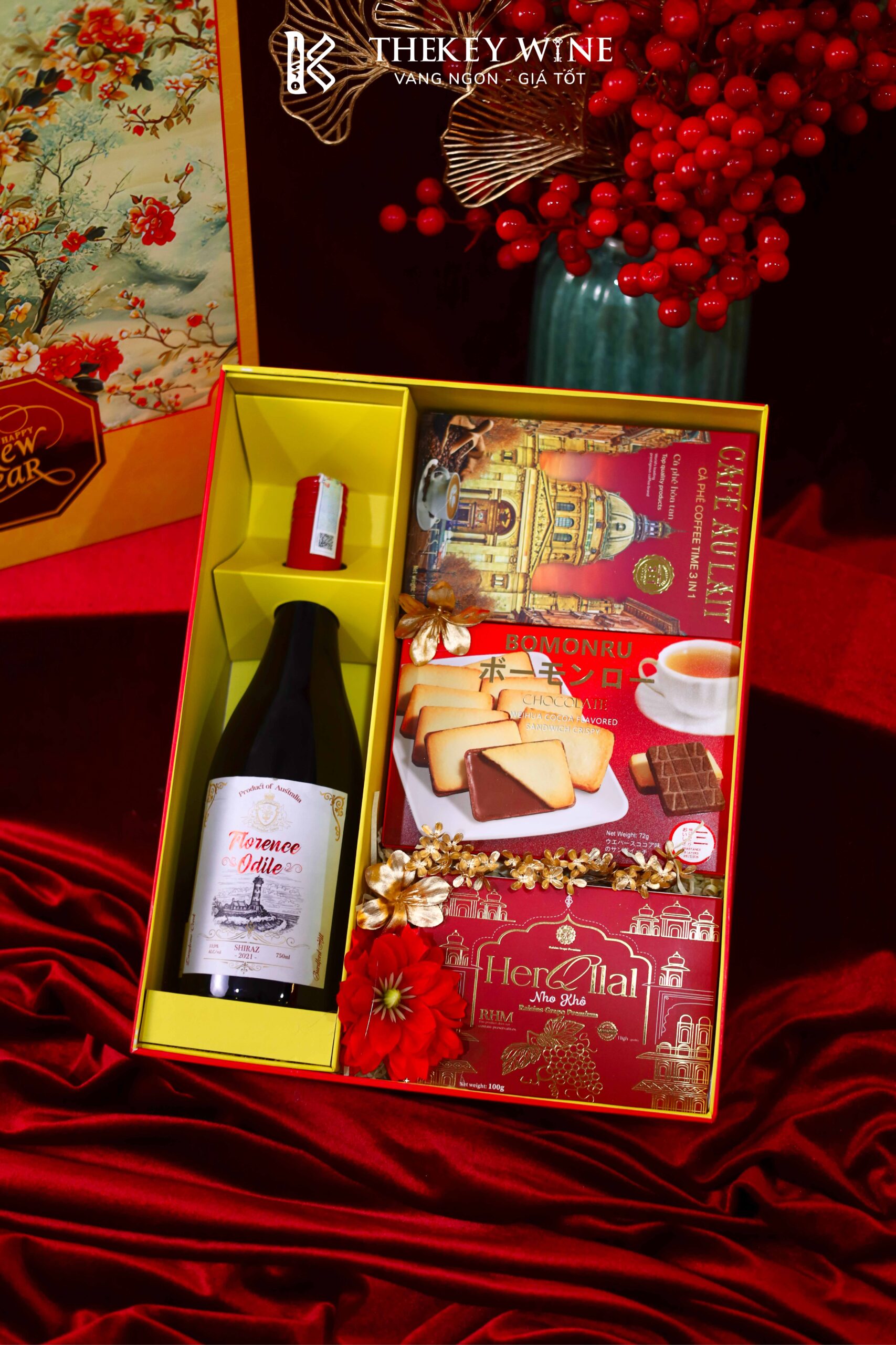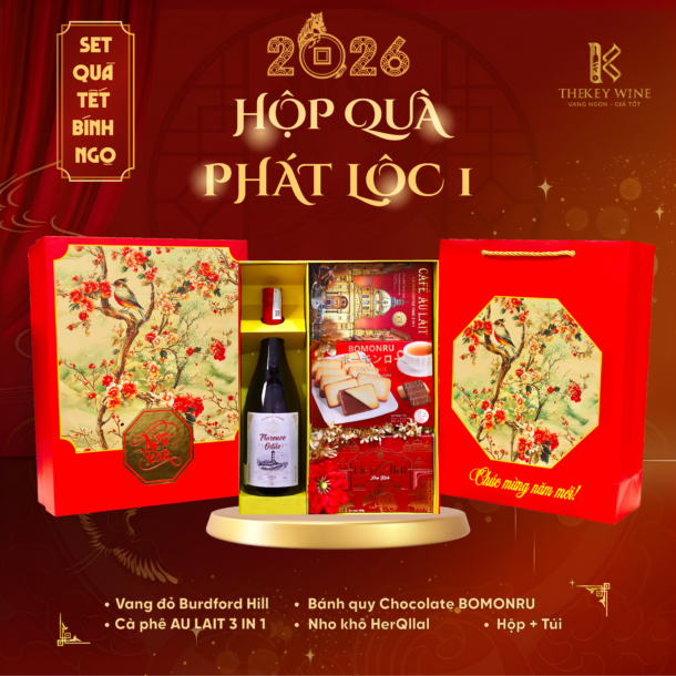 Set Quà Phát Lộc 1 mang đến sự kết hợp hài hòa giữa vang Úc Burdford Hill 13.9% và các món quà ngon miệng: cà phê, bánh chocolate, nho khô. Được đóng trong hộp & túi thiết kế sang trọng, set quà như lời chúc năm mới may mắn – thịnh vượng – phát tài dành tặng đối tác & người thân.