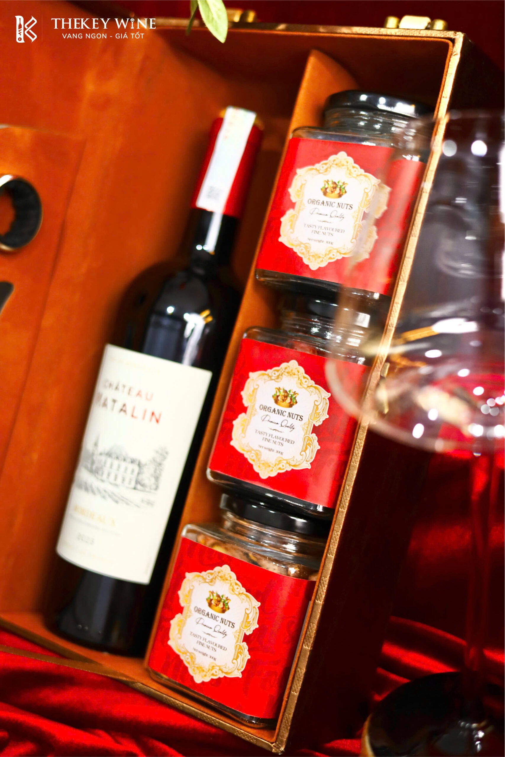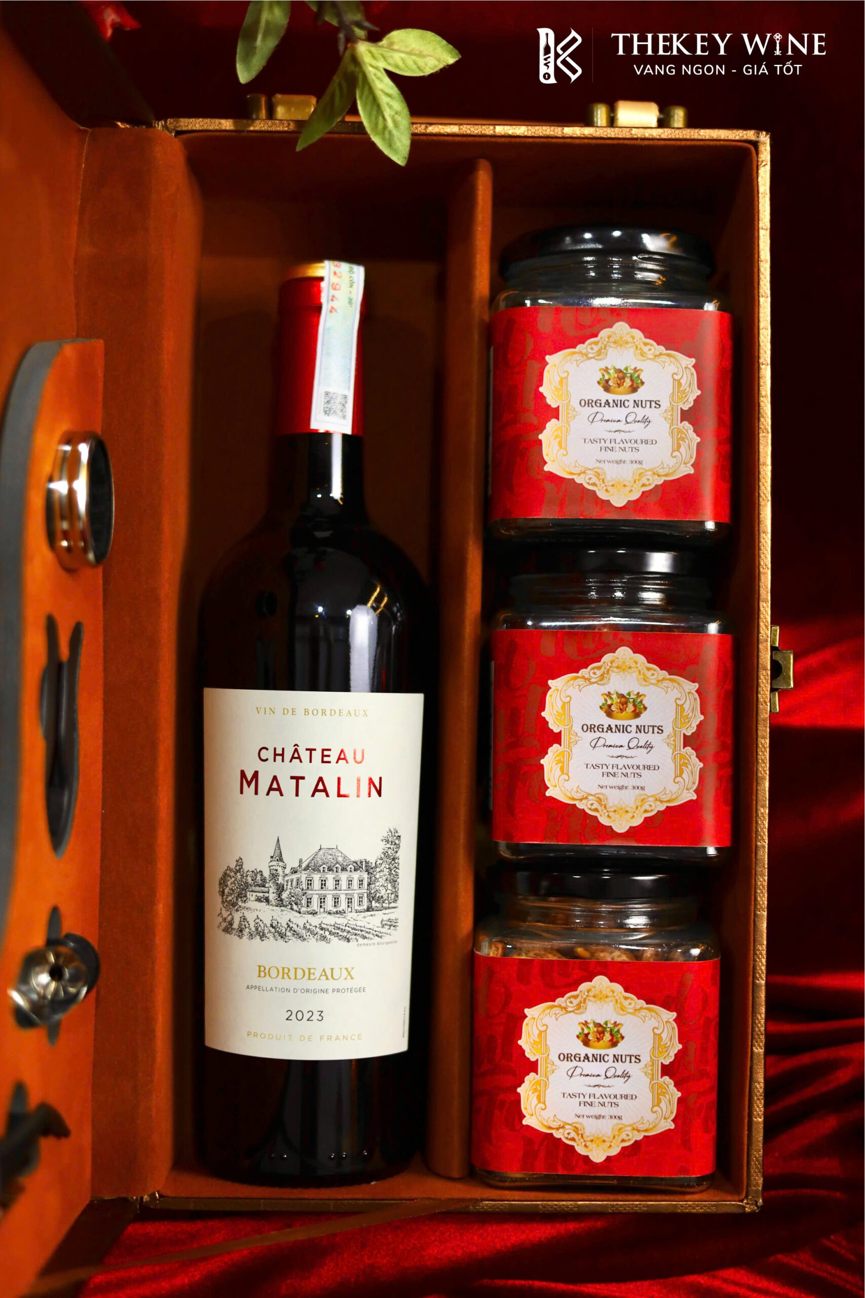 Set quà Tết Bính Ngọ Cát Tường 3 2026 là món quà tinh tế với sự góp mặt của vang Pháp Matalin 14% hòa quyện cùng hũ táo đỏ, hũ hạt điều rang muối và hũ hạt macca cao cấp. Tất cả được đặt trong hộp quà thiết kế sang trọng, chỉn chu từng chi tiết, thay cho lời chúc năm mới an khang – tài lộc – vạn sự như ý gửi đến đối tác và những người thân yêu.