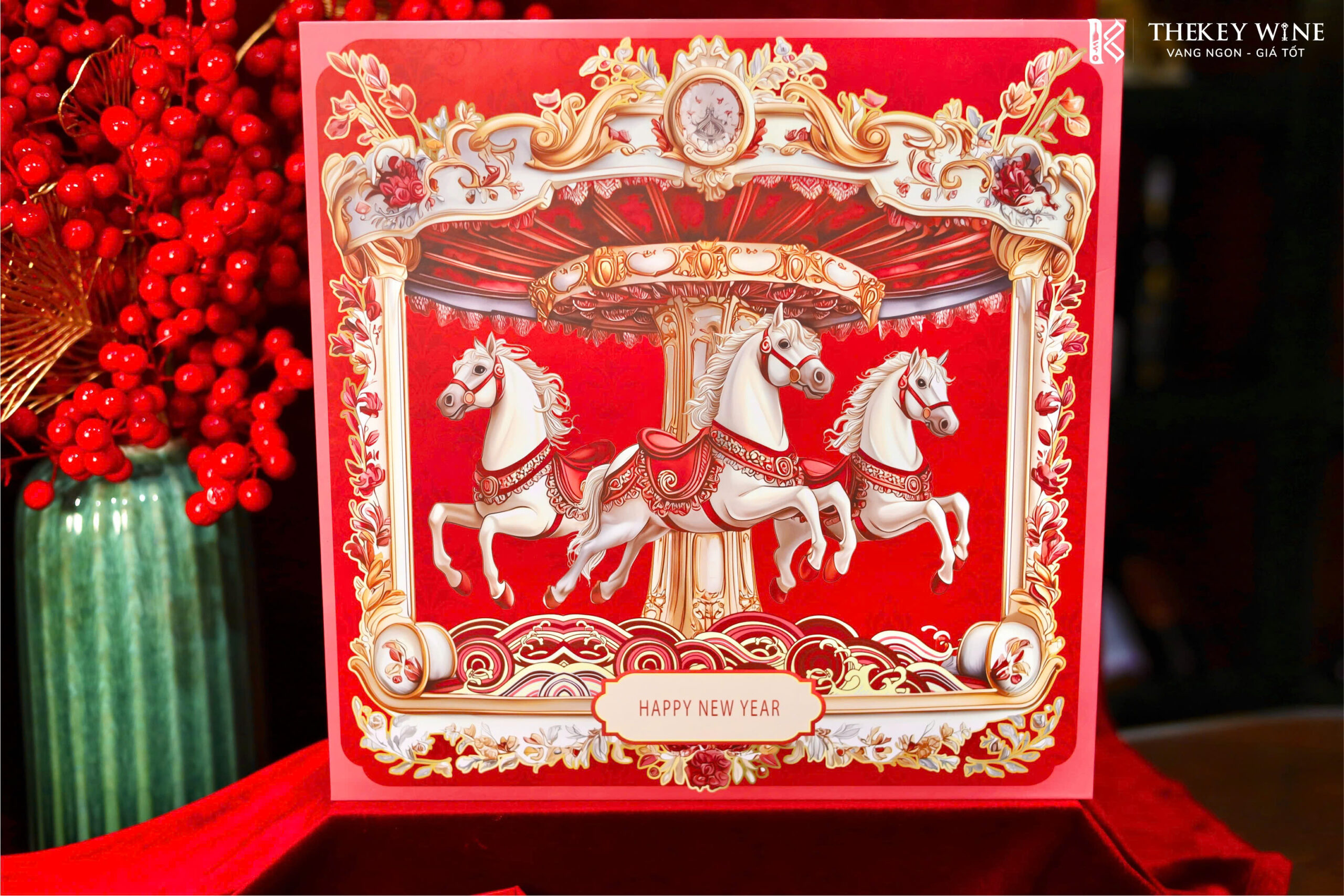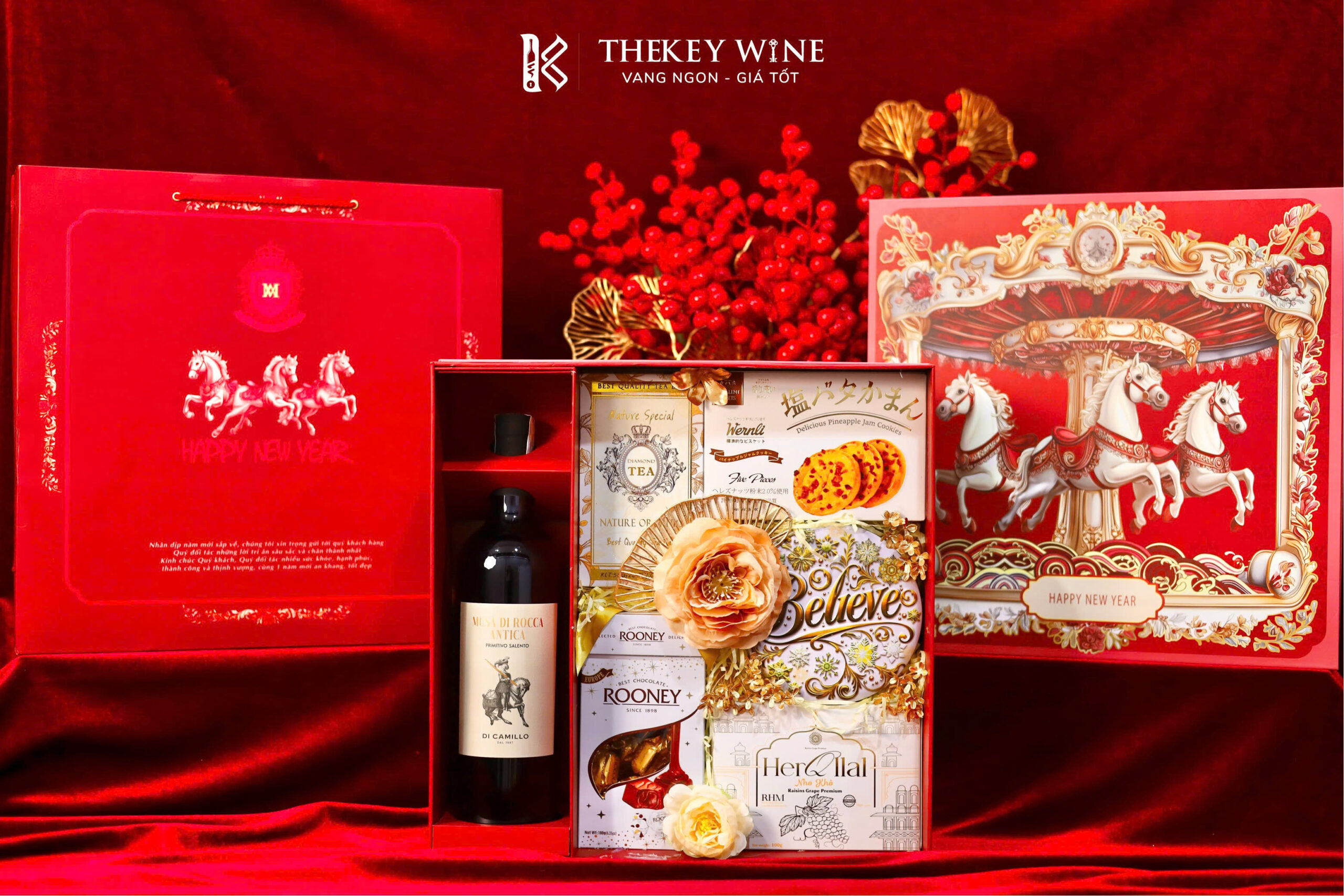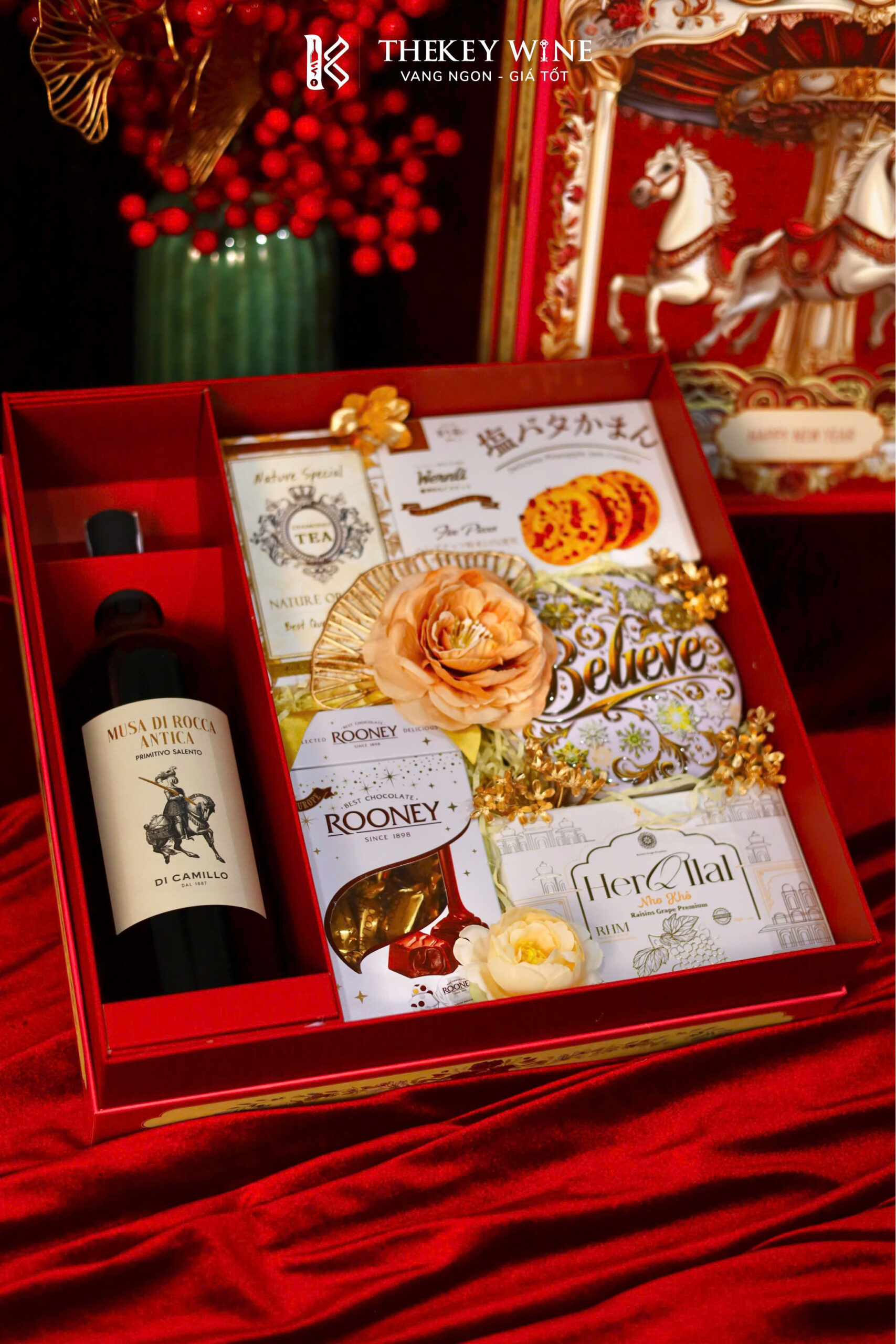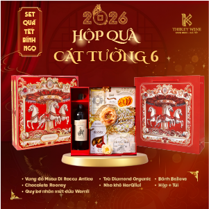 Set quà Tết Bính Ngọ Cát Tường 6 2026 mang đến sự kết hợp hài hòa giữa vang Ý Musa Di Rocca Antica 14.5% và các món quà ngon miệng: chocolate, nho khô, bánh quy, trà và quy bơ. Được đóng trong hộp & túi thiết kế sang trọng, set quà như lời chúc năm mới may mắn – thịnh vượng – phát tài dành tặng đối tác & người thân.