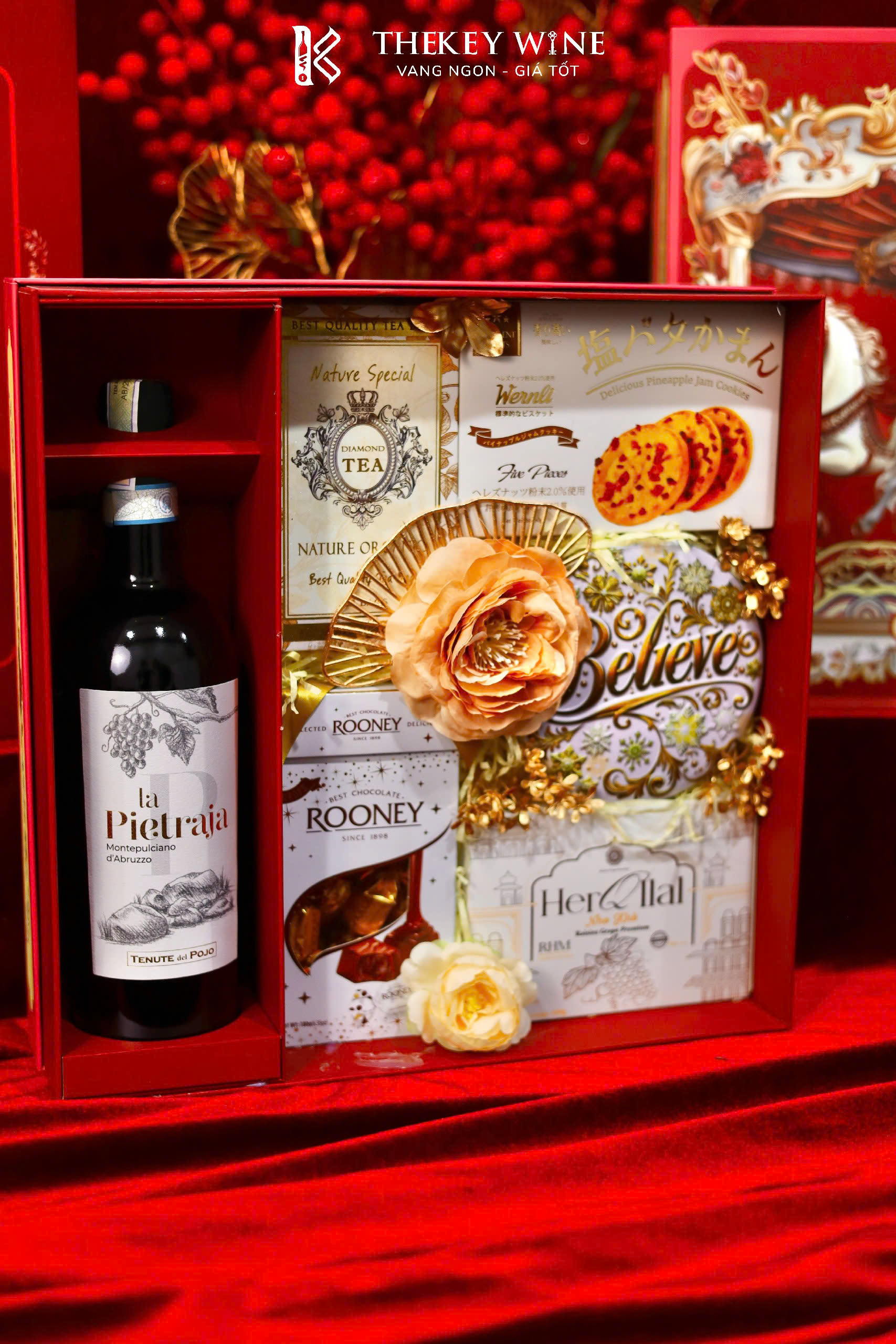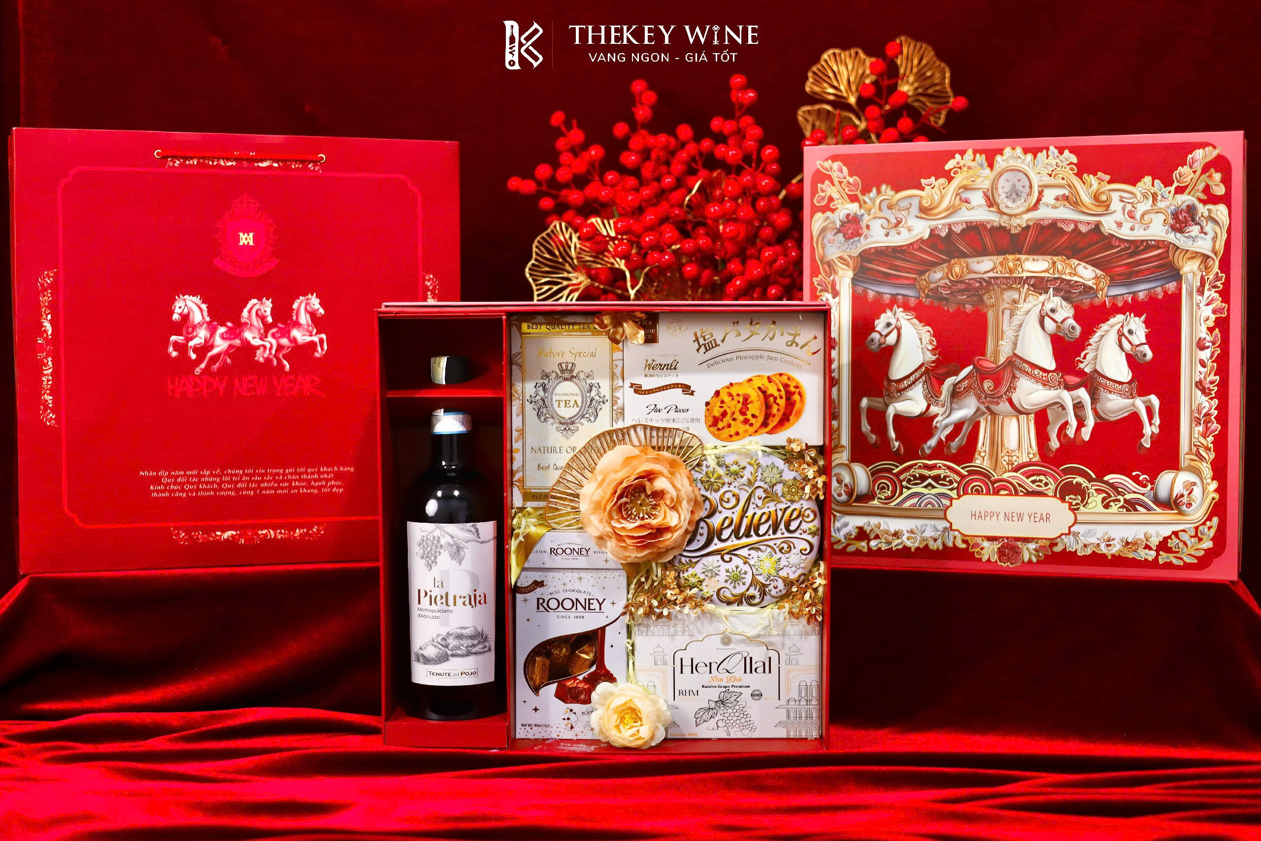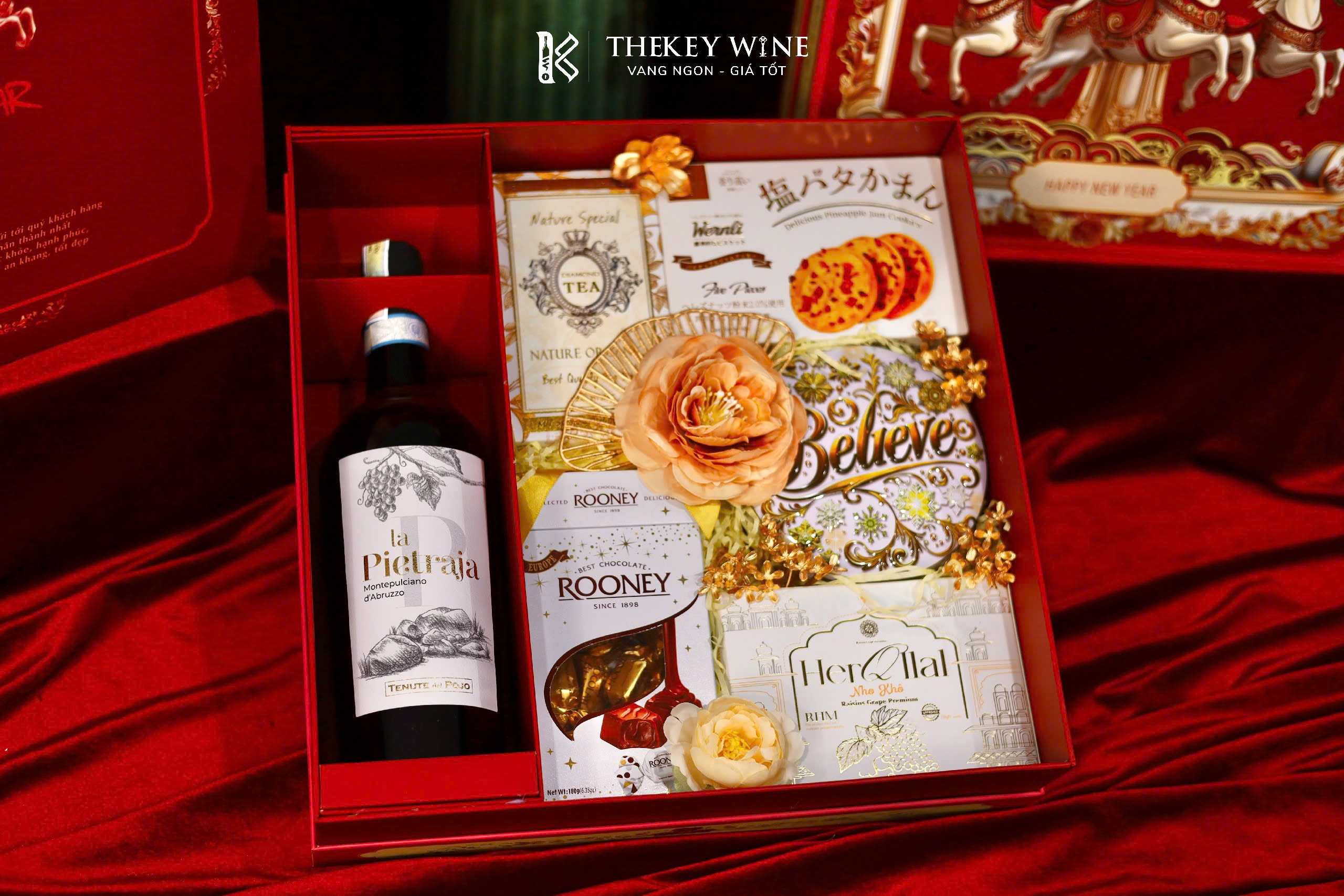 Set quà Tết Bính Ngọ Cát Tường 7 2026 mang đến sự kết hợp hài hòa giữa vang Ý La Pietraja 15% và các món quà ngon miệng: chocolate, nho khô, bánh quy, trà và quy bơ. Được đóng trong hộp & túi thiết kế sang trọng, set quà như lời chúc năm mới may mắn – thịnh vượng – phát tài dành tặng đối tác & người thân.