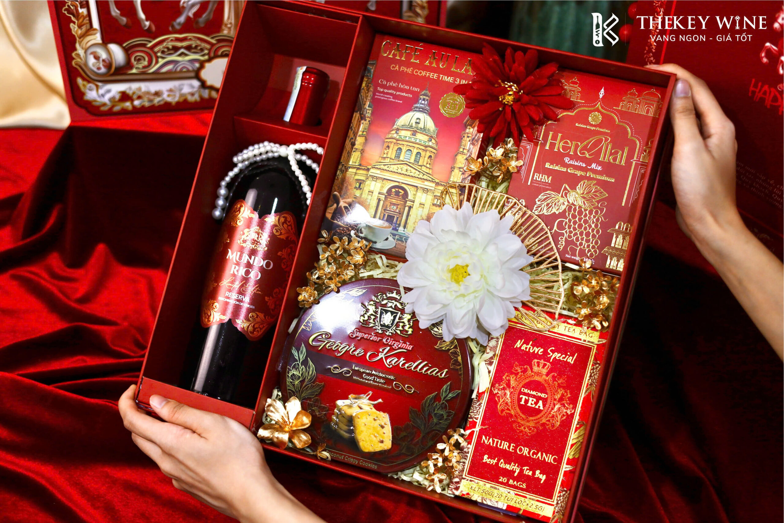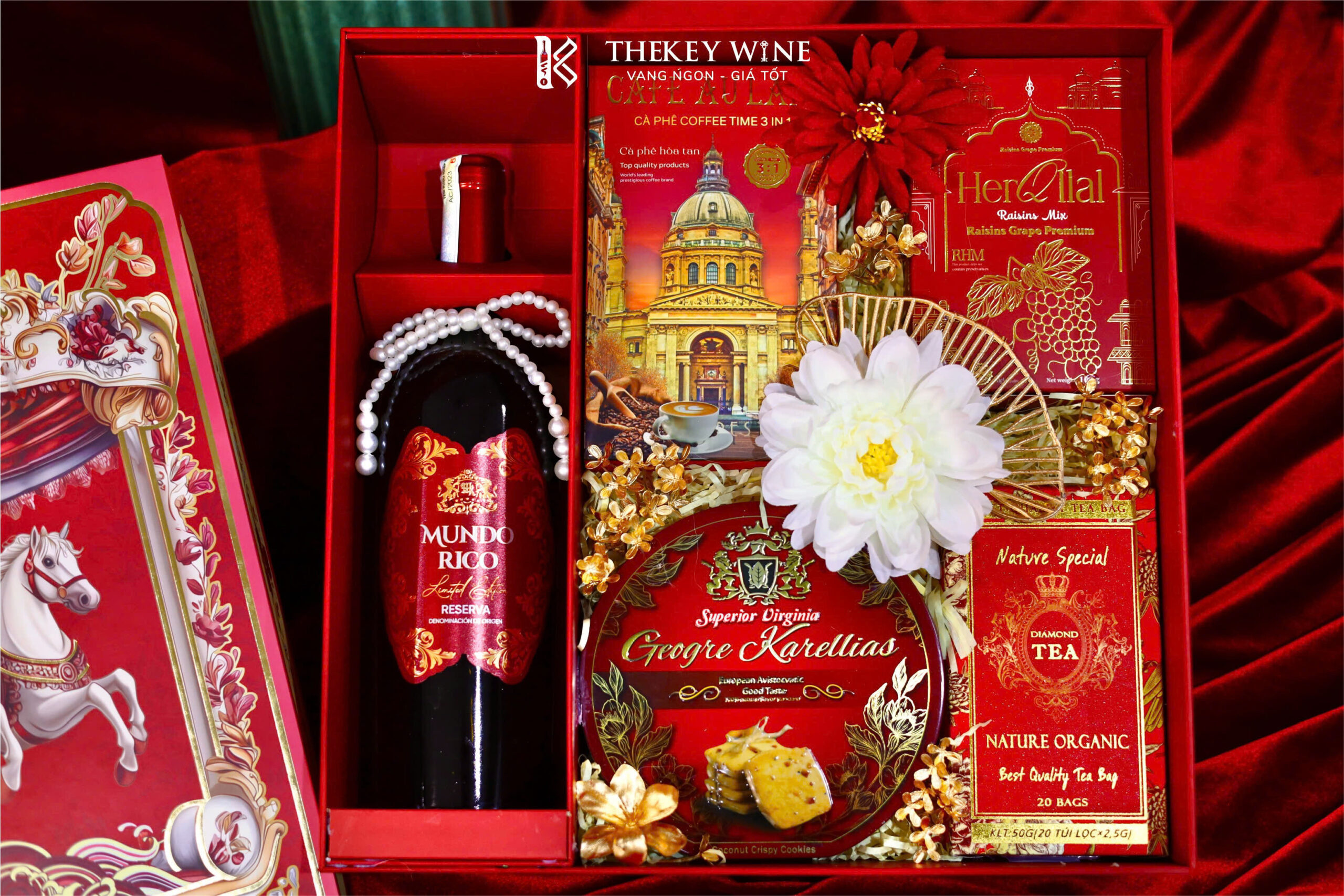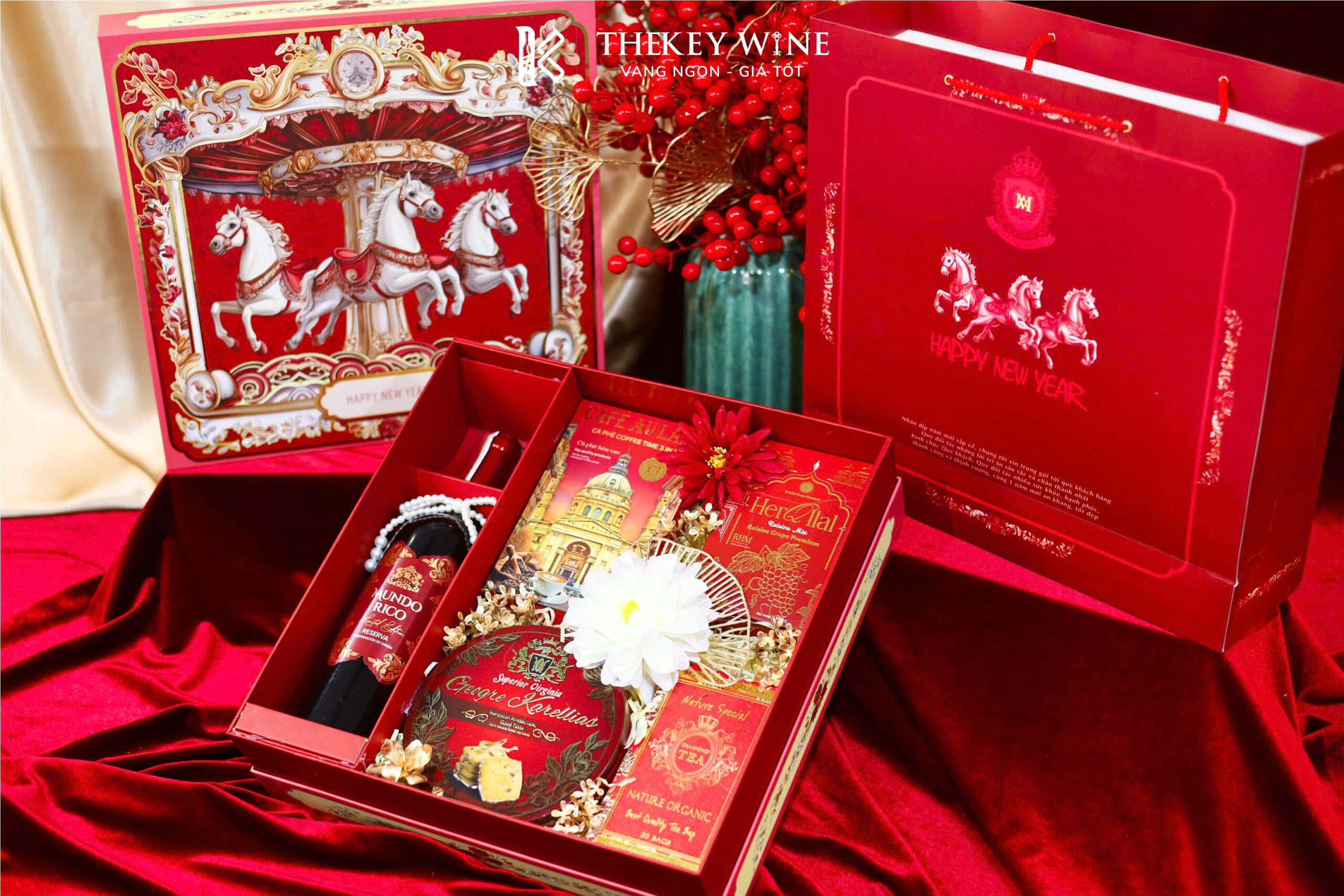 Set quà Tết Bính Ngọ Phát Lộc 4 2026 mang đến sự kết hợp hài hòa giữa vang Tây Ban Nha Mundo Rico 14% và các món quà ngon miệng: cà phê, bánh quy, trà. Được đóng trong hộp & túi thiết kế sang trọng, set quà như lời chúc năm mới may mắn – thịnh vượng – phát tài dành tặng đối tác & người thân.