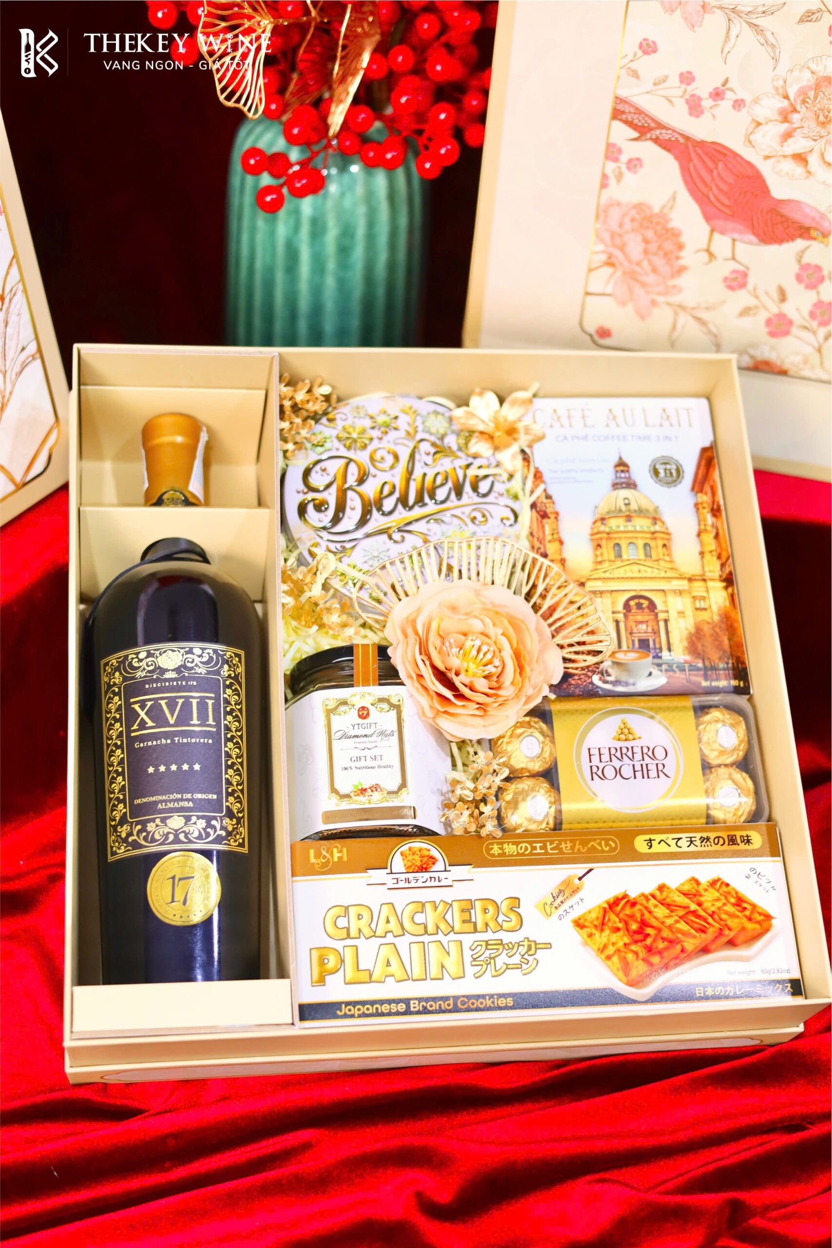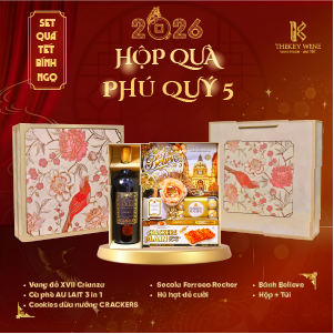 Set quà Tết Bính Ngọ Phú Quý 5 2026 mang đến sự kết hợp hài hòa giữa vang Tây Ban Nha XVII Crianza 17% và các món quà ngon miệng: cà phê, bánh quy, Socola và hạt dẻ cười. Được đóng trong hộp & túi thiết kế sang trọng, set quà như lời chúc năm mới may mắn – thịnh vượng – phát tài dành tặng đối tác & người thân.